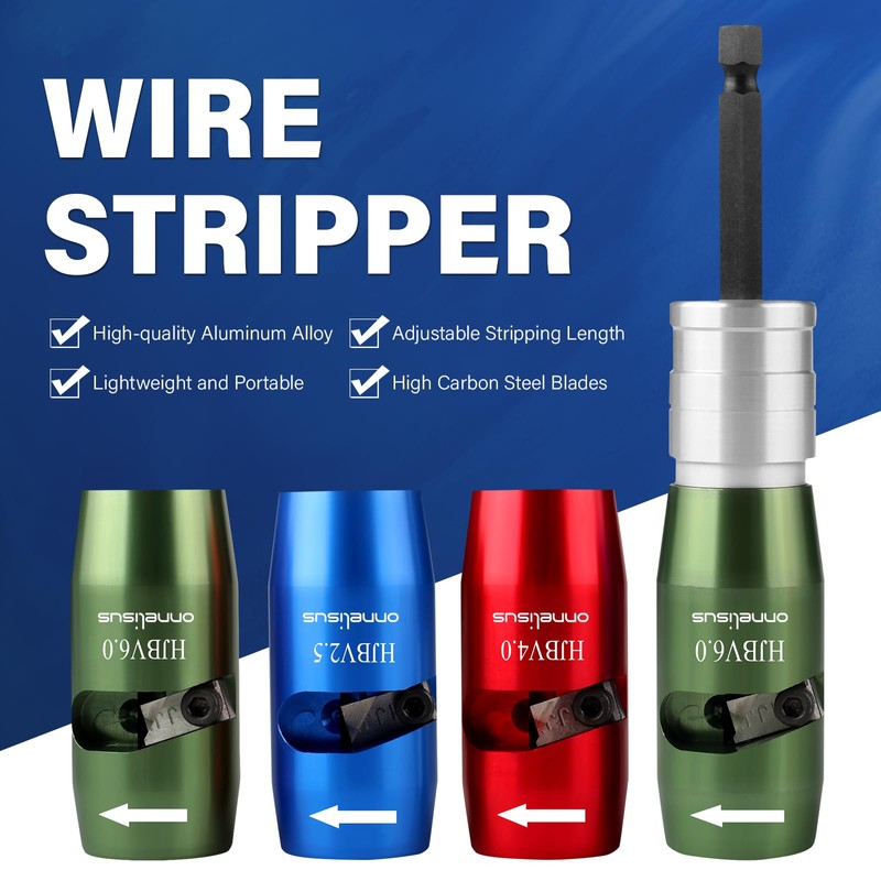 - [Portable Efficiency] The Onnelisus wire stripper drill attachment's lightweight, portable design, crafted from durable aluminum in vibrant blue, red, yellow and green, makes it an essential tool for effortless wire stripping on the go.