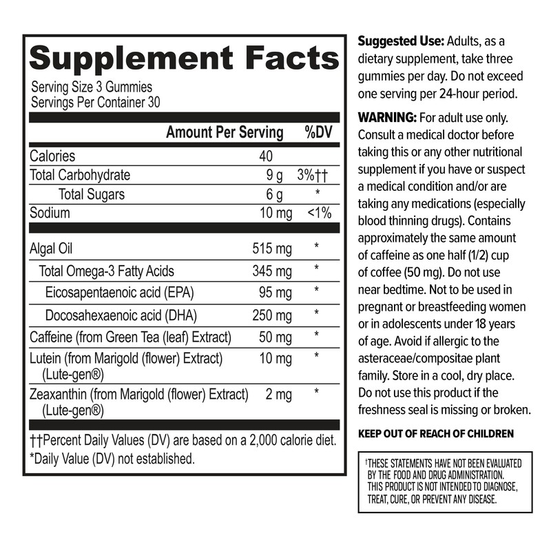 - SUPPORTS MENTAL SPEED: A neuro-focused gummy formulated with brain-supporting vegan Omega-3s, lutein & zeaxanthin for visual health, and a low amount of caffeine derived from green tea to support attention and reaction time.