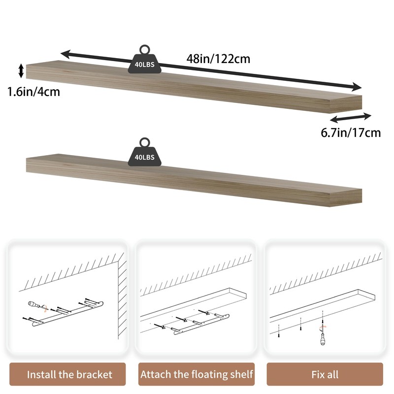 - 【Size】large Wall shelf Wooden plank size:Length 60in x Width 6.7in x Thickness 1.6in.