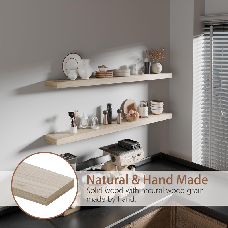 ONOTETUT Long Floating Shelves for Wall,Solid Wood Long Shelves Set of 2,Rustic Wall Mounted Shelves with Invisible Brackets for Decor & Storage (Natural, 48 Inch)