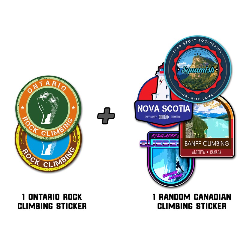 - 1 x Ontario Rock Climbing sticker plus 1 x Canadian climbing sticker (random - Squamish, Nova Scotia, Quebec, Banff), because climbers loves stickers