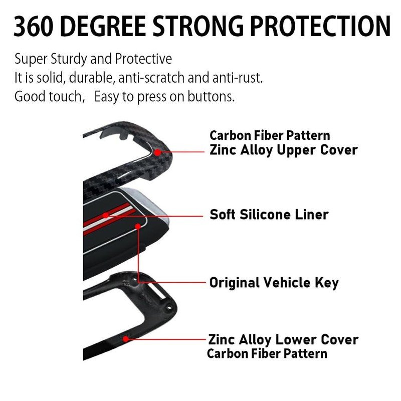 • MATERIAL:This car key case is designed with a zinc alloy outer case and a silicone inner case.The metal shell builds a solid protective barrier that can effectively resist scratches,collisions and abrasions in daily use.Even if the key is accidentally dropped or rubbed against hard objects,it can still keep the key body intact as it was in the first place.The soft and elastic silicone inner shell can accurately fit the key buttons,which makes the pressing operation becomes light and smooth.