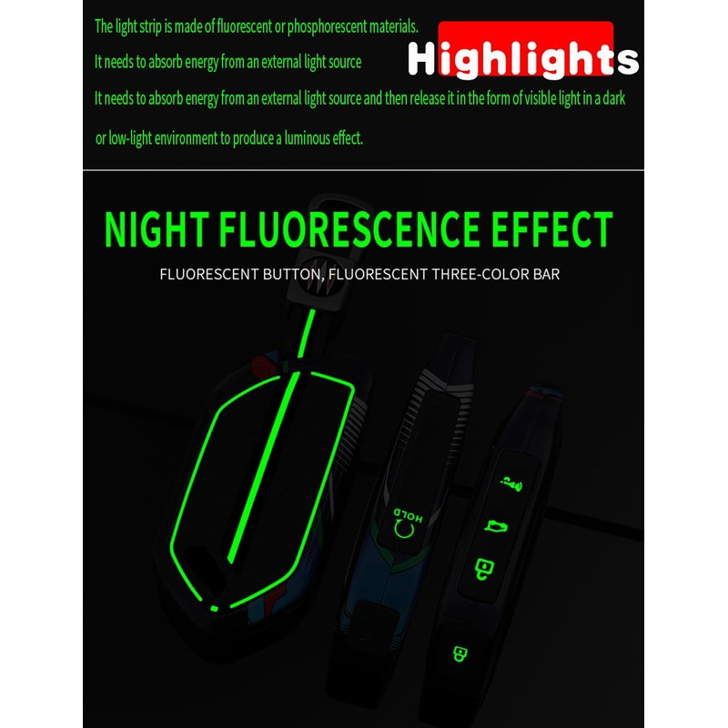 - 【LUMINOUS DESIGN】- Unique luminous design. The luminous strips are made of fluorescent or phosphorescent materials and need to absorb sunlight during the day. They will be released in the form of visible light in the dark or low-light environment. This design can provide great help for you to use the car key in the dark.