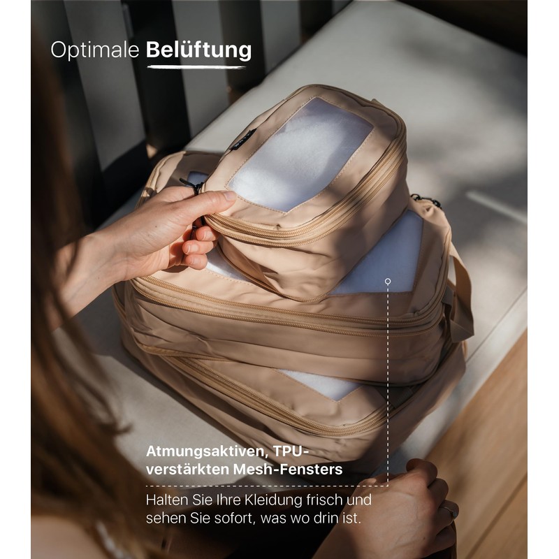 - Everything at a glance and perfectly sorted: thanks to the transparent mesh window, you can immediately know what is in the travel organisation pockets. The compression packing cubes allow the best ventilation and put an end to musty smell in the travel bag once and for all.