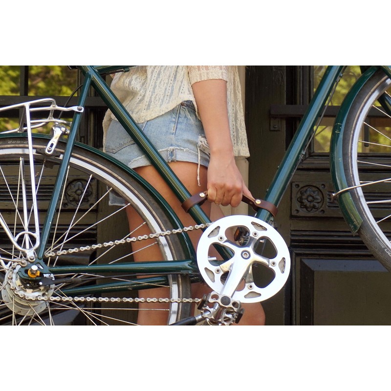 - Easily carry your bike up or down the stairs with this slick bike handle. It makes lifting your bicycle a breeze. Hidden clamps keep the leather from stretching over time.
