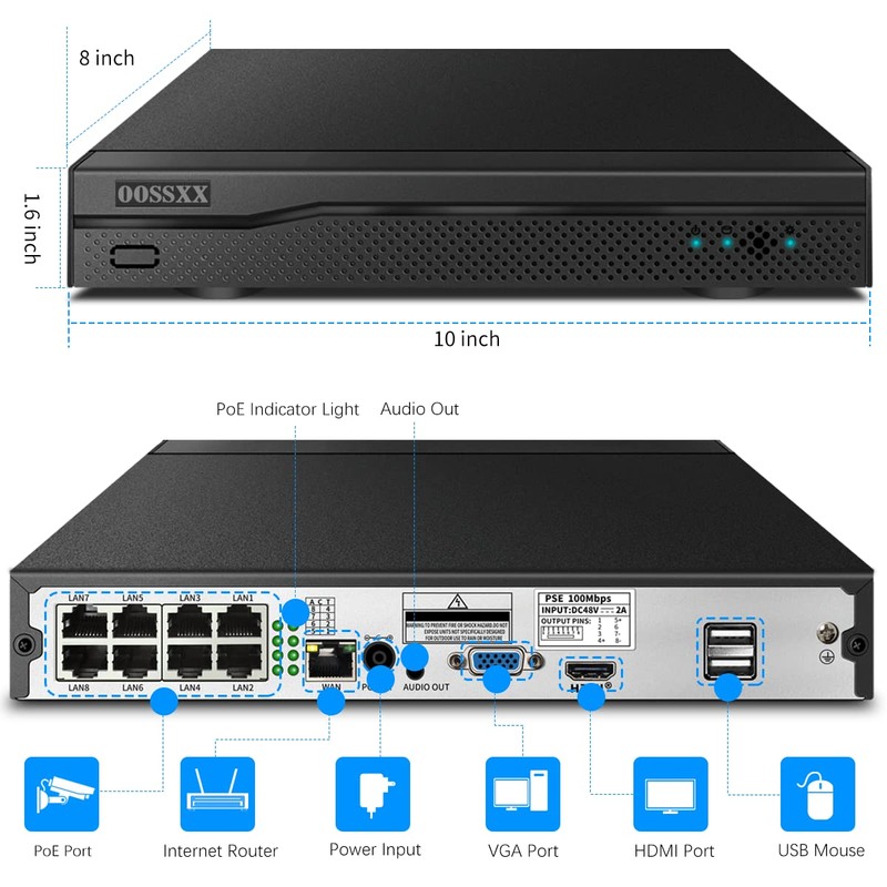 OOSSXX POE NVR Network Recorder Video 4K / 8.0 Megapixel 8-Channel, Supports up to 8 x 8MP/4K IP Cameras