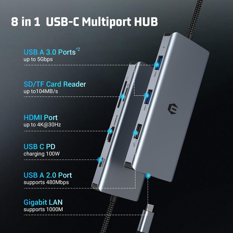 - 8 in 1 USB C docking station: the docking station is powerful with 4K @ 30Hz HDMI output, 100W USB-C PD charging port, Gigabit Ethernet port, SD & TF and 3 USB-A ports. So that you get an efficient work and living space.