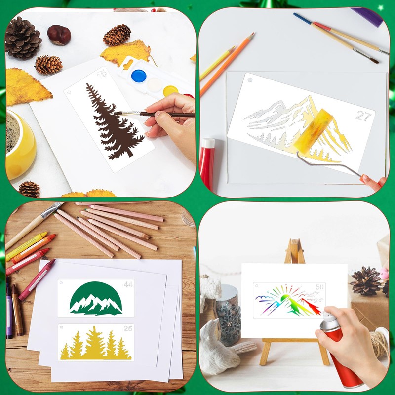 - 【What You Get】You will get 50 pieces reusable nature painting stencils of with pine tree and mountain patterns; Each stencil measures approx.2"x4" (5x10cm). A metal chain is provided for storage.