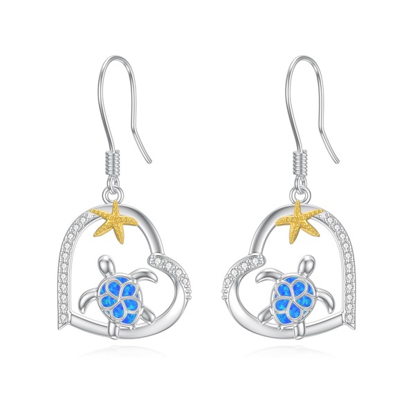 Opal Turtle Earrings 925 Sterling Silver Sea Turtle Hanging Earrings Ocean Turtle Jewellery Gifts for Women Girls, Sterling Silver, Blue Opal
