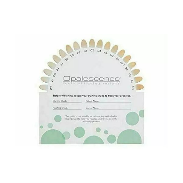 Product descriptionOne Opalescence Tooth Shade Guide The Opalescence Shade Guide Card makes it easy to track the shade change in patients’ smiles during a whitening treatment. Arranged in shade value order to make whitening results easier to see Hand-held and easy to use with areas to record initial and final shades Though not a replacement for a traditional shade guide, a great way to help patients see the difference at home.3.75" x 3.75' Coated paper. About the product