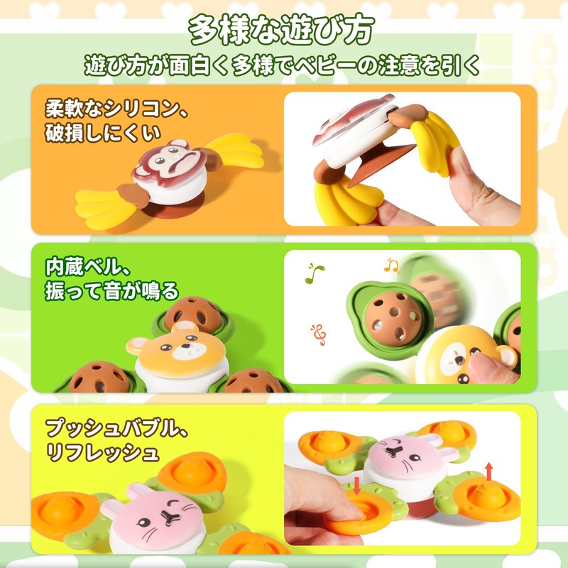 - 【Multi-sensory stimulation promotes overall development】 - Each Spinner Toy has a rich sense of stimulation. The sound of the bear bell develops the sound sensation, the bunny bubbles improve the tactile experience, and the monkey soft silicone material helps fine exercise and nurture teeth. Through the diverse sensory stimulation, children can develop their ability in multiple directions