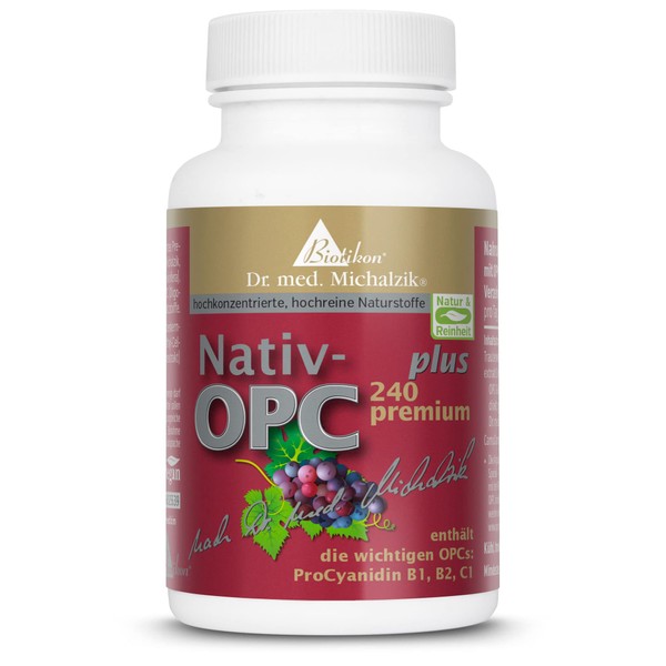 Unlike Nativ-OPC premium, OPC premium plus CamuCamu extract contains as a natural source of vitamin C. - 240 mg OPC minimum content in the grape seed extract content of the capsule measured directly in the extract - OPC measured according to the RP-HPLC method test specification PV.03.P194_2 - Protection by mass spectrometry and diode array detection - OPC are proanthocyanidins without monomeric proanthocyanidins idine - 45 0 mg premium grape seed extract according to Dr. Michalzk - 380 mg total polyphenols per capsule from 450 mg grape seed extract. - Made in Germany - Certified product for your safety - Nativ-OPC premium plus contains no additives except the capsule - Suitable for vegetarians