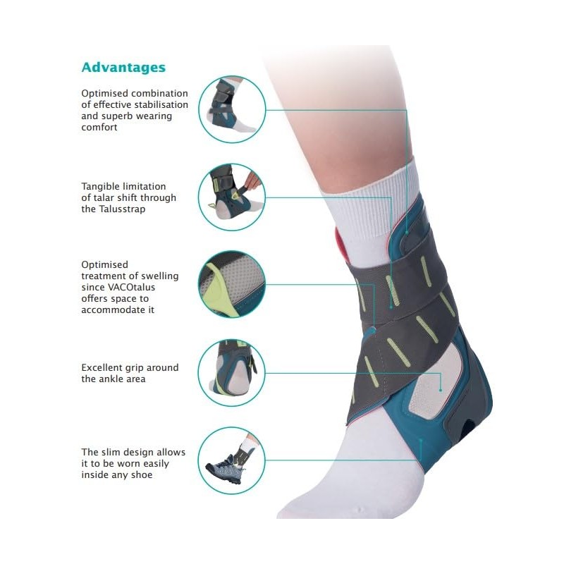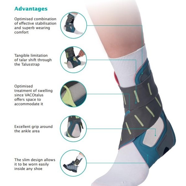 The ankle brace VACOtalus encloses the ankle like a bandage and has a compressing effect. Thus it offers an optimal combination of effective stabilization and good wearing comfort. The brace is easy to wear inside a shoe and under pants. VACOtalus is characterized by its high stability and the integrated VACO12 cushions ensure an optimal fit around the ankle. The embedding not only provides additional support, but also for good ventilation.