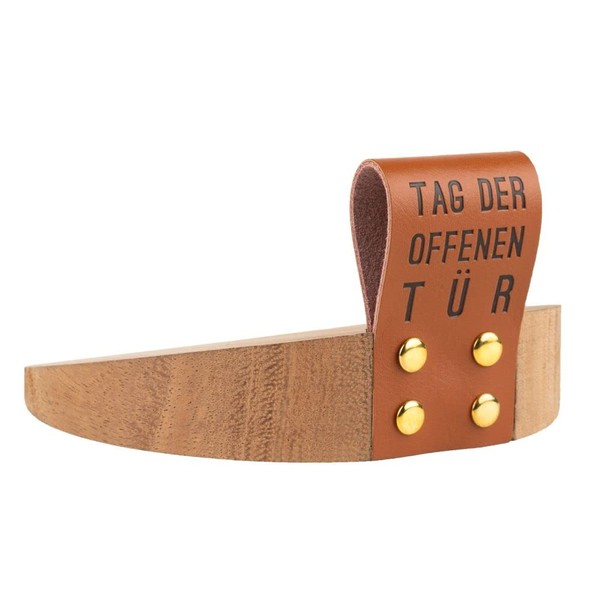 - The door wedge with the matching saying. This is made of oak wood and has a leather loop with embossing.