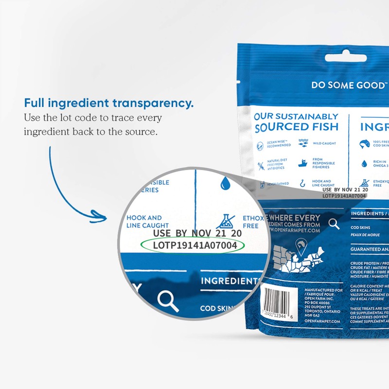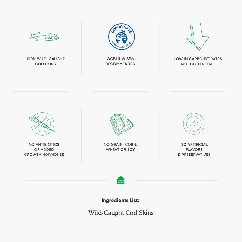 - JUST ONE INGREDIENT: Open Farm's clean Dehydrated Cod Skin Treat formula has only one ingredient, cod skins that are naturally packed with Omega-3 fatty acids for heart health and general wellness, without artificial food colors or preservatives.
