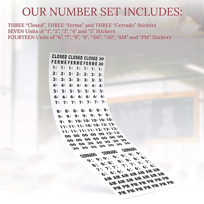 - ✅ CUSTOMIZABLE NUMBERS: The store hours sign kit contains a series of number and letter stickers so you can tailor and personalize the business hour cling to display your exact business hours in your storefront. The large open hours sign has dimensions of 11.7 inches tall by 7.7 inches long and is made of plastic.