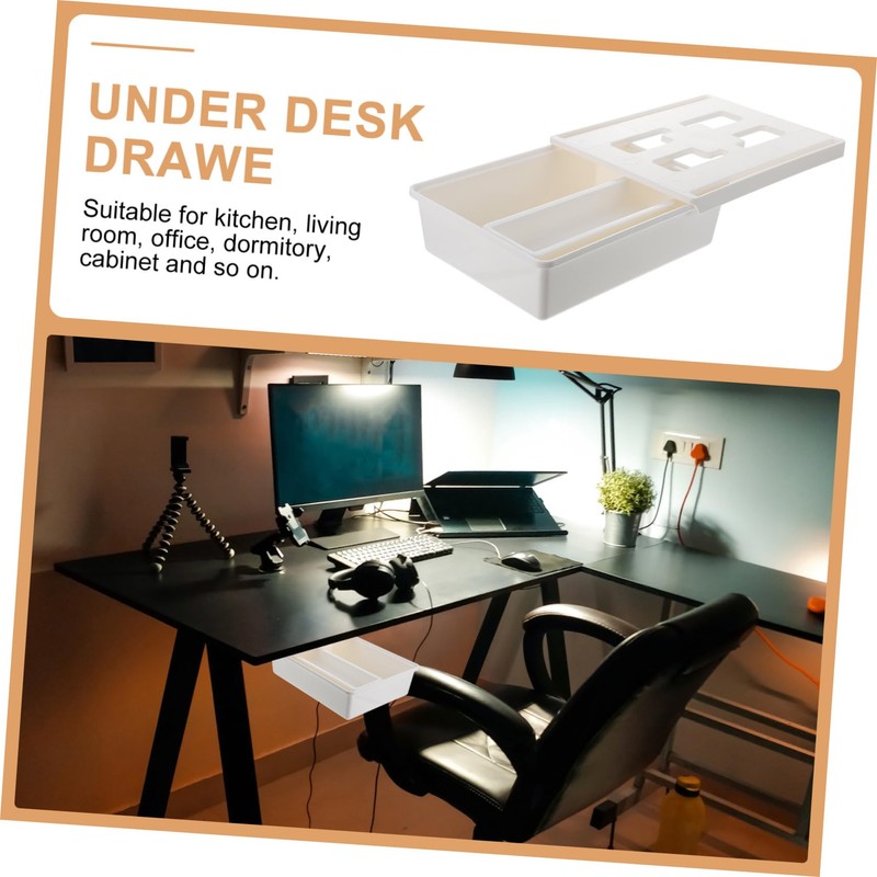 desk pencil drawer This is a desk drawer, which is manufactured with premium plastic material, and practical enough to use.Under Desk Drawer No need to punch holes, no tools, just paste our drawer organizer on the bottom of the table, even if you are a beginner can easily complete.desktop drawer A your pen, ruler, eraser, tissue, scissors, key, etc
