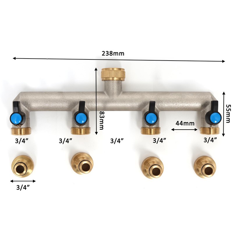 - 【Technische Daten】Geeignet für in Europa gebräuchliche 3/4" Hähne, 3/4" Innengewinde(ø24mm) zur Verteilung des Wasserflusses auf ein 4-Wege Ventil mit 3/4" Außengewinde(ø26mm).Und wird mit 4 Messingadaptern für den Anschluss an 1/2" Wasserleitungen geliefert.
