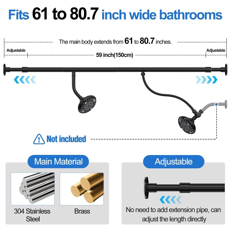 - 【ADJUSTABLE FOR MOST BATHROOMS】Our double shower system is perfect for shower spaces from 61 to 80.7 in(155 to 205cm) wide. It has two fully adjustable telescopic rods to allow you to change the height and angle to suit your space in most bathrooms