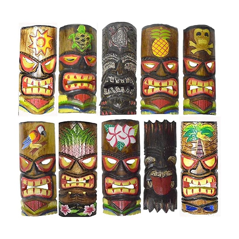 This set of 10 awesome Polynesian style wall masks is hand-carved from wood, then hand-stained and hand painted. Each mask measures approximately 12 inches tall, and 4 1/2 to 5 inches wide. They look great on walls in patios, living rooms, offices, bedrooms, even in kitchens.These wall masks makes a great gift for friends and family. PLEASE ALLOW FOR VARIATION IN SIZE AND COLOR, MASKS ARE ALL HANDMADE. *****1 Mask might be different than pictured*****