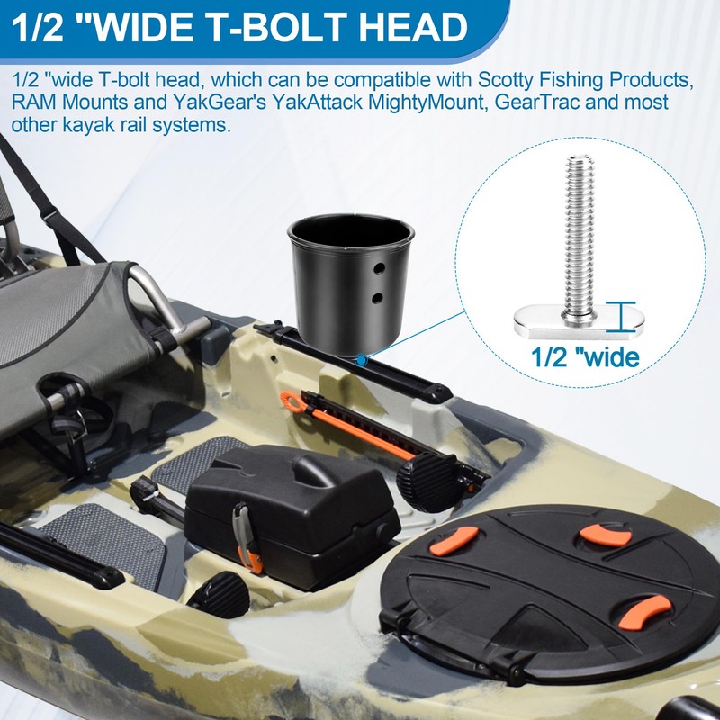 - 1/2 "Wide T-bolt Head: Kayak cup holder adopt 1/2 "wide T-bolt head, which can be compatible with Scotty Fishing Products, RAM Mounts and YakGear's YakAttack MightyMount, GearTrac and most other kayak rail systems.