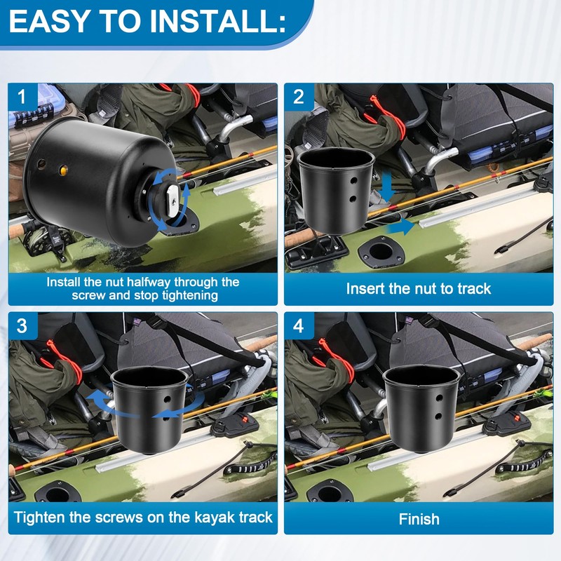 - Easy to Install: Installation and removal cup holder is quickly without tools. Install the nut halfway through the screw and stop tightening, tighten the screws on the kayak track, The cup holder is fixed on the kayak track.