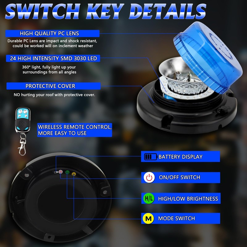 - 🏆:【Applications & Warranty】:Blue wireless strobe lights are widely used for all Emergency vehicles and Trucks, Construction car,Work vehicles, Tractors, Maintenance vehicles,snowplows and other DC12-24V vehicles. We also offer 2-year warranty and 24-Hour service.Any questions, please feel free to contact us.