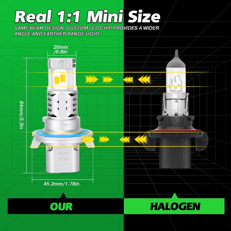 - 【Real 1:1 Mini Size with Halogen H13 Bulbs】 1:1 Design with halogen h13 headlight bulbs, plug & play, easy to install. Applied the same beam design as the original h13 high beam or low beam bulbs, the ultra-thin led chip interval provides a wider angle and farther range light on the road. No blinding and dazzles oncoming drivers, and give your safe driving experience.