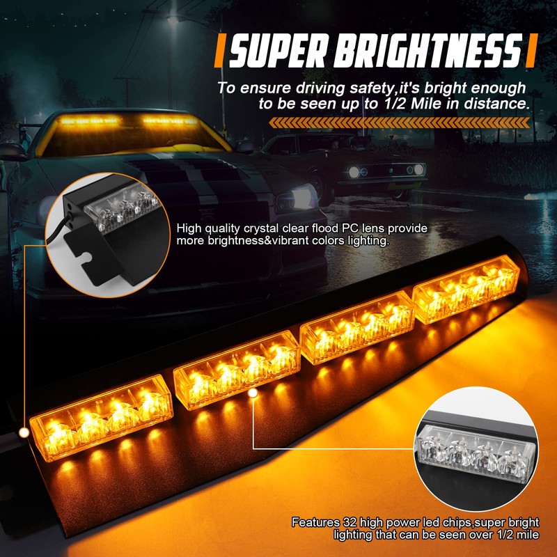 - 2.【2-in-1 LED Windshield Strobe Lights】Amber white LED Dash strobe lights bars, adopted with 32 high brightness LEDs and crystal PC Lens, provide maximum visibility in nighttime and daytime. Ensure safety driving on the road.