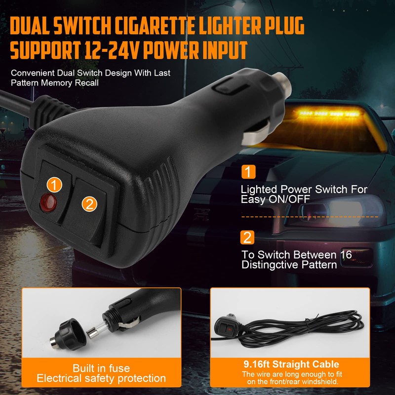- 1.【16 Flashing Patterns】16 flashing pattern LED visor strobe light adds stylish style to your car.More outstanding and eye-catching on the road.You can switch the pattern via the pushing “Pattern Switching Button” on cigarette lighter. The led strobe lights also have “Last Pattern Recalling” function.