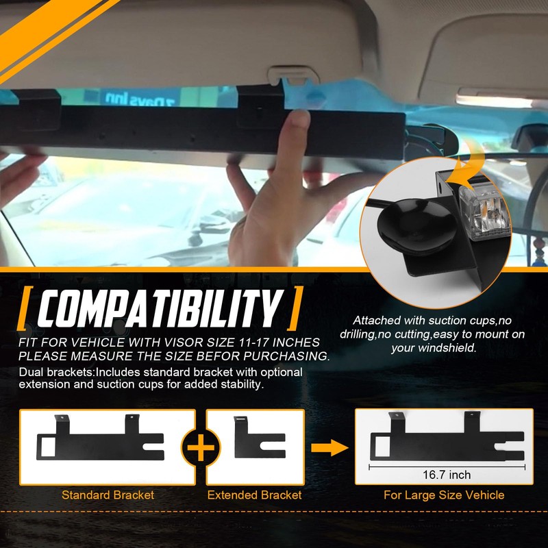 - 3.【Installation Note】This light bar including two mounting brackets(standard bracket and optional extension) and is suitable for vehicle sun visors in sizes 11-17 inches DOES NOT compatible with F150,NOT compatible with F250,NOT compatible with Ram 1500,NOT compatible with Ram 3500,NOT compatible with Sierra 1500,NOT compatible with Sentra,NOT compatible with Econoline,NOT compatible with Focus, NOT compatible with 4Runner,NOT compatible with Duramax, Equinox,Altima,Mazda 3/CX-9.