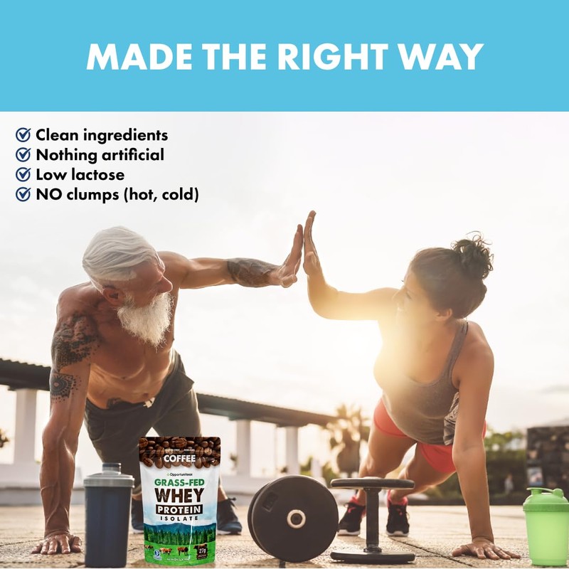 Opportuniteas Opportuniteas Coffee Whey Protein Powder - Low Carb & Keto Friendly - Grass Fed Whey Isolate + Colombian Coffee - 60 mg Caffeine for Energy - Pre or Post Workout Drink Mix, Latte, Shake & Smoothie 1lb