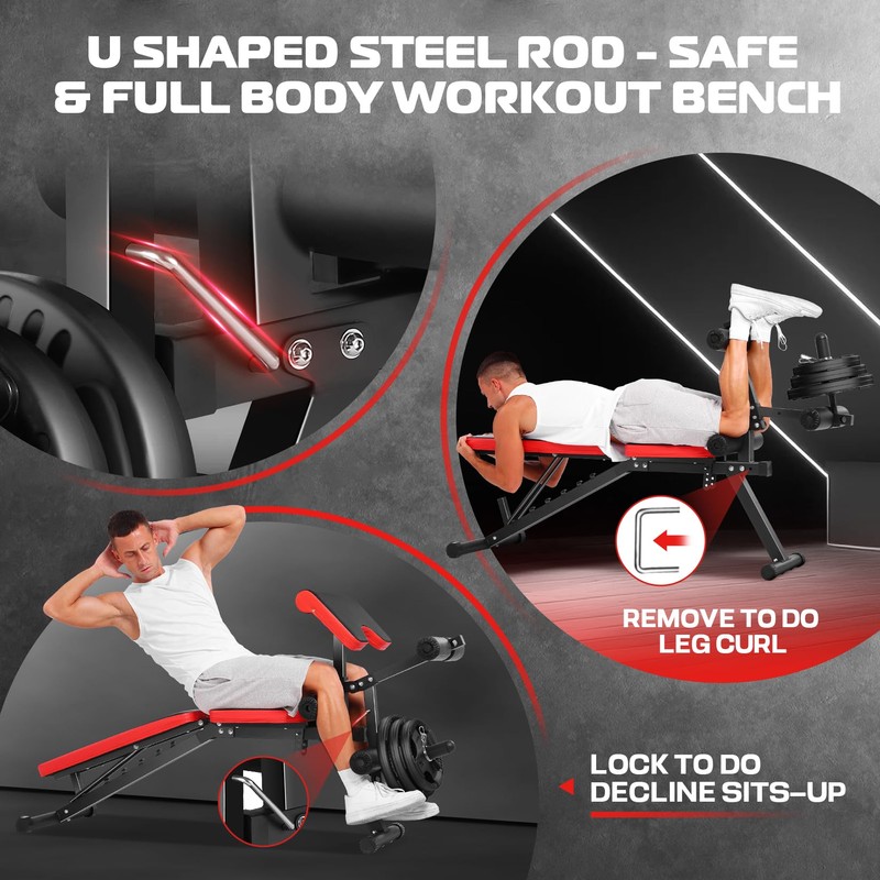 - 【8 in 1 Workout Bench Press】 You can enjoy different exercises in bench press for the full-body such as bench press, chest press, shoulder press, reverse fly, arms rowing, incline curl, leg curl/leg extension and so on.