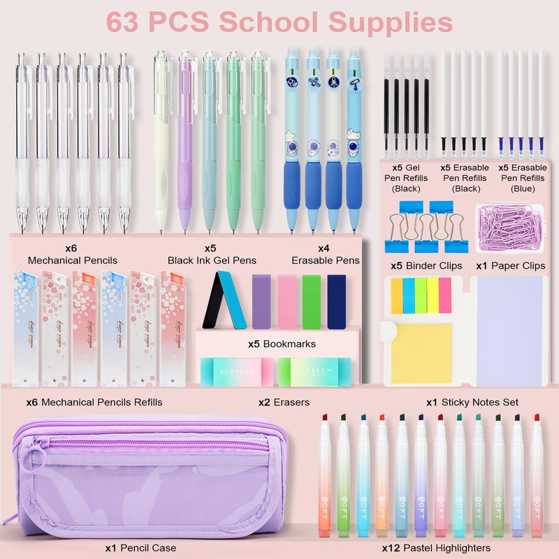 - 【63 PCS Stationery Set】This comprehensive school supplies kit includes everything students need: 5 black gel pens with 5 refills, 4 erasable pens with 10 refills (blue and black ink), 6 mechanical pencils (3 x 0.7mm, 3 x 0.5mm) with 6 refills, 12 highlighters, 1 large pencil case, 2 erasers, 1 sticky notes set, 5 special bookmarks, 1 box of paper clips, and 5 binder clips.