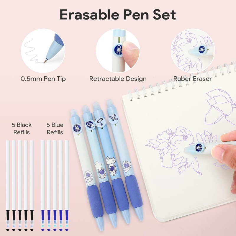 - 【Erasable & Gel Pens】This gel pen set includes 4 erasable pens and 10 refills that allow you to write, erase, and rewrite cleanly. Also included are 5 gel pens that deliver a smooth, skip-free writing experience. This kawaii stationery set includes refills for extended use.