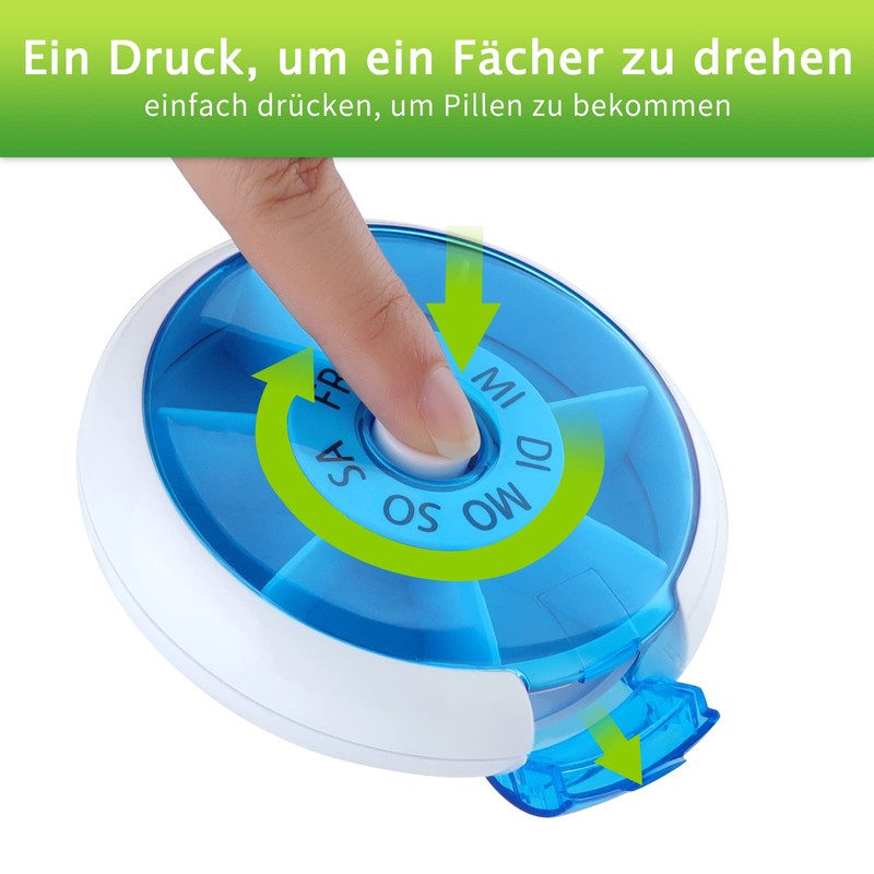 Füllen Sie die Fächer mit Ihren Medikamenten, öffnen Sie die Box, indem Sie den weißen Knopf drücken und die Innenfächer drehen sich im Uhrzeigersinn. Greifen Sie durch die Lukentür auf jedes Segment einzeln zu, um die Pillen herauszunehmen und die Box zu reinigen.
