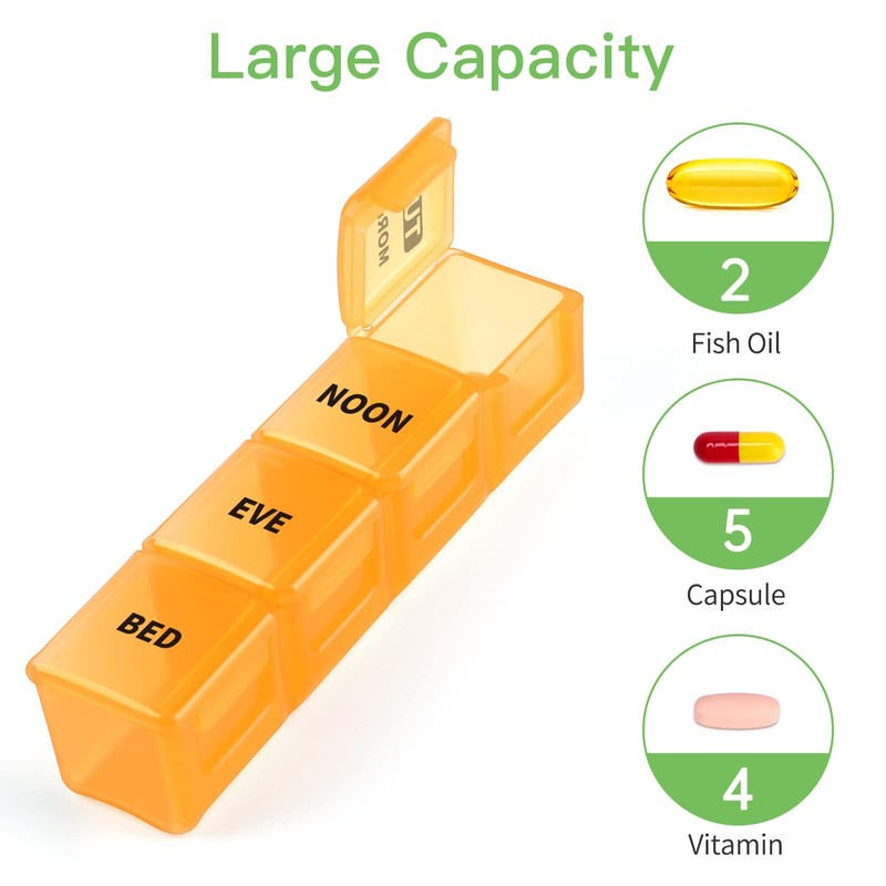 - Easy to Use: With English printing, easy to track if take the pills. Each daily pill box has 4 compartments