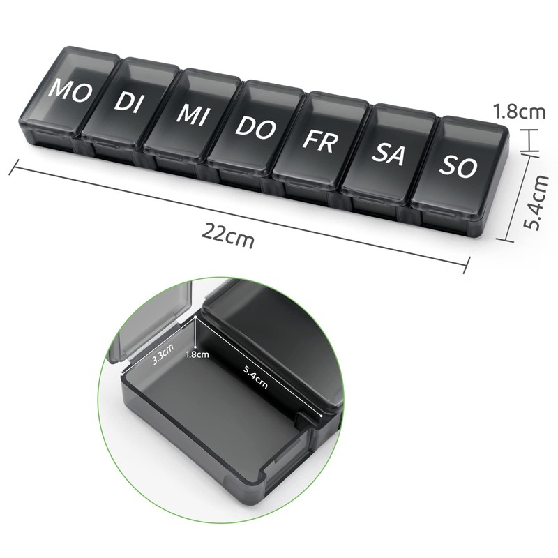 - 【Große Kapazität】 Die Medikamentenbox besteht aus sieben separaten Fächern, in denen Medikamente für eine Woche aufbewahrt werden können. In jedem Fach der Tablettenbox können 5 Stück Fischöl, 12 Stück Vitaminen oder 14 Stück Kapseln hinzugefügt werden, Produktgröße: 22 x 5,4 x 1.8 cm.