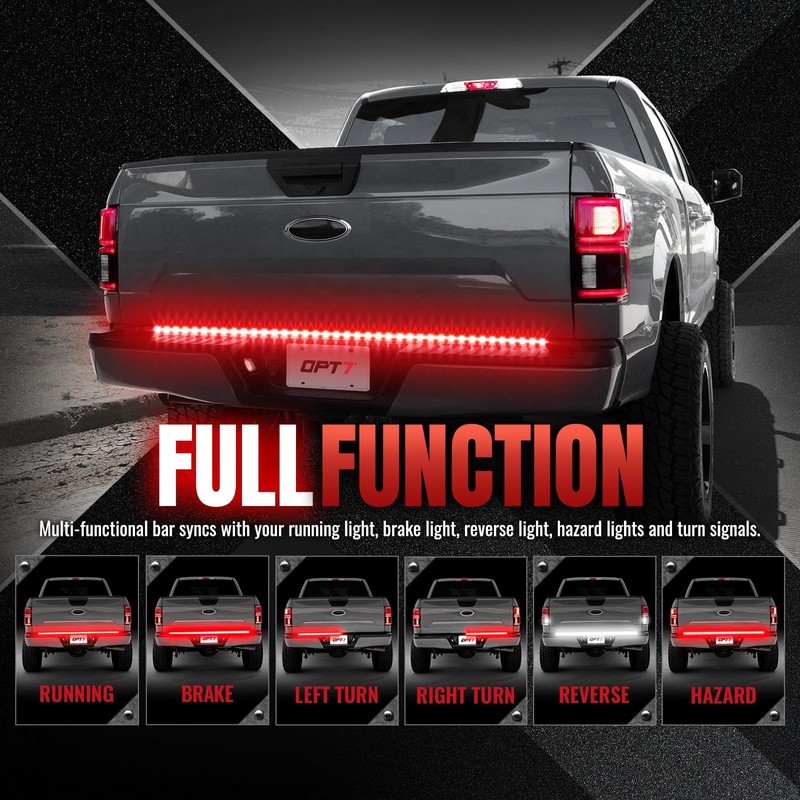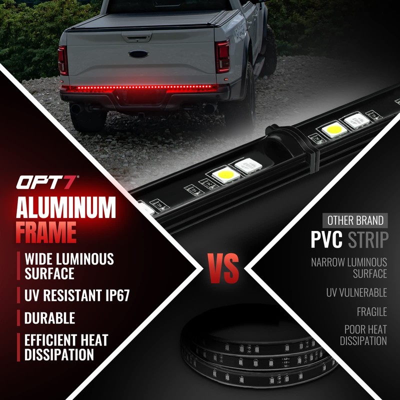 - [BRIGHT UP THE WAY] The sleek tailgate light bar adds style and safety that gives your rig an enhanced look. No need to worry about being unseen on the dark road. Fully designed by OPT7 adopts 90 SMD with 5050 LED chips bright up to 30ft away!