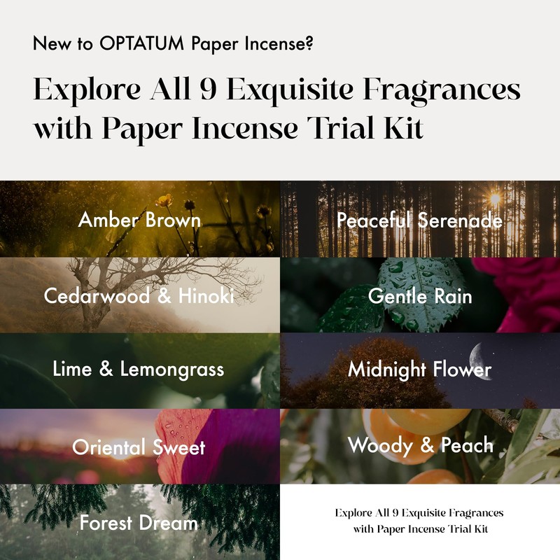 - [Discover Your Favorite] Before selecting the regular Paper Incense Kit or when you want to try a new scent from OPTATUM, the Trial Kit is available for you to experience all 9 exquisite fragrances, each individually packaged. Tear off 1 strip to use for any fitting occasion!