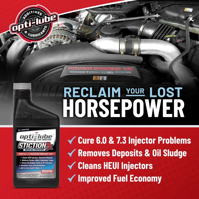 - RECLAIMS LOST HORSEPOWER: Rev up your engine when you use Opti-Lube Stiction Rx! This oil treatment reclaims your lost horsepower, virtually restoring your engine to its full capacity.