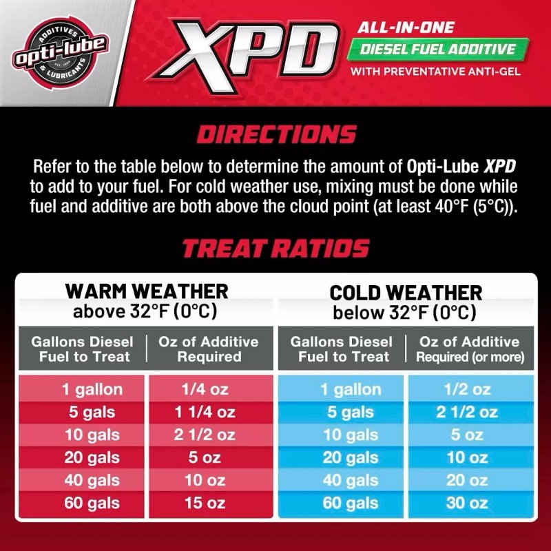 Whether during rain, snow, or shine, Opti-Lube XPD formula delivers. It works to improve the performance of your truck all year round. This fuel additive also helps separate water from Diesel fuel as a demulsifier and more than doubles the storage life of standard diesel fuel.