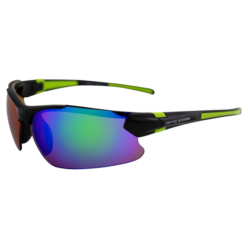 Optic Edge Ricochet Wraparound Sports & Motorcycle Sunglasses for Men or Women Black Semi-Rimless Frame w/Dielectric Green Mirror Lens