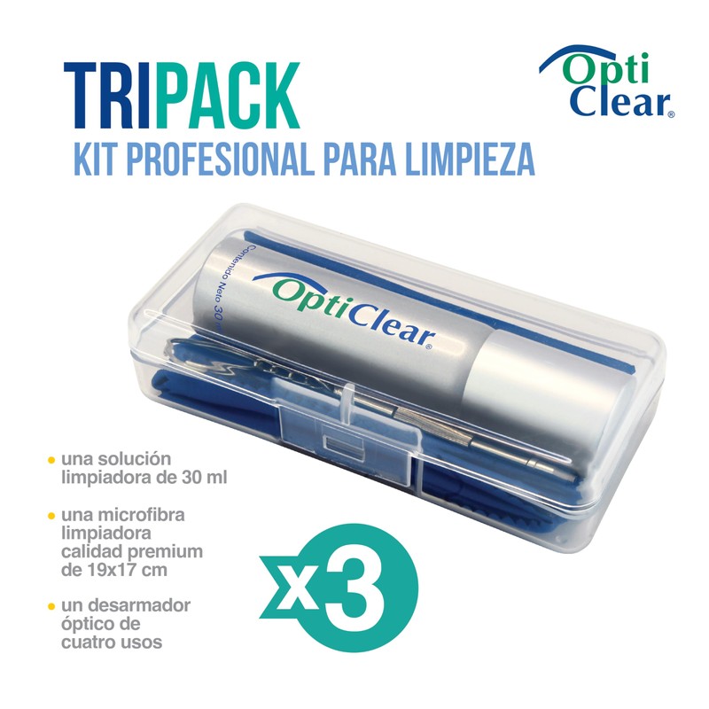 Opticlear® Tripack Limpiador de Lentes antiempañante 3 Piezas calidad premium, 3 microfibras/paños, 3 desarmadores oftalmicos