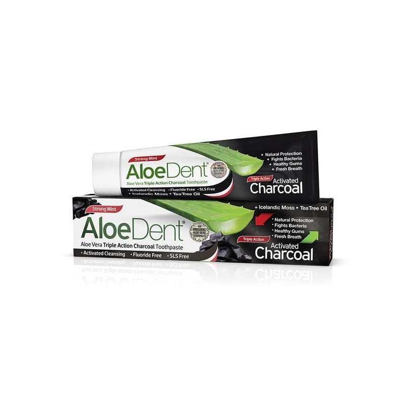 Optima Aloe Dent Triple Action Activated Charcoal Strong Mint Toothpaste protects teeth and gums with aloe vera, activated charcoal, icelandic moss and tea tree oil.