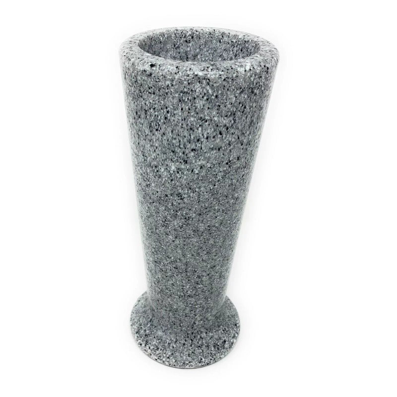 The vases have a genuine granite/stone appearance and are 9.5 inches (241 mm) tall by 3.75 inches (95 mm) wide. The opening in the top can be used to place flowers inside. The opening is tapered and with the smallest size at 1.75 inches (44 mm) diameter.