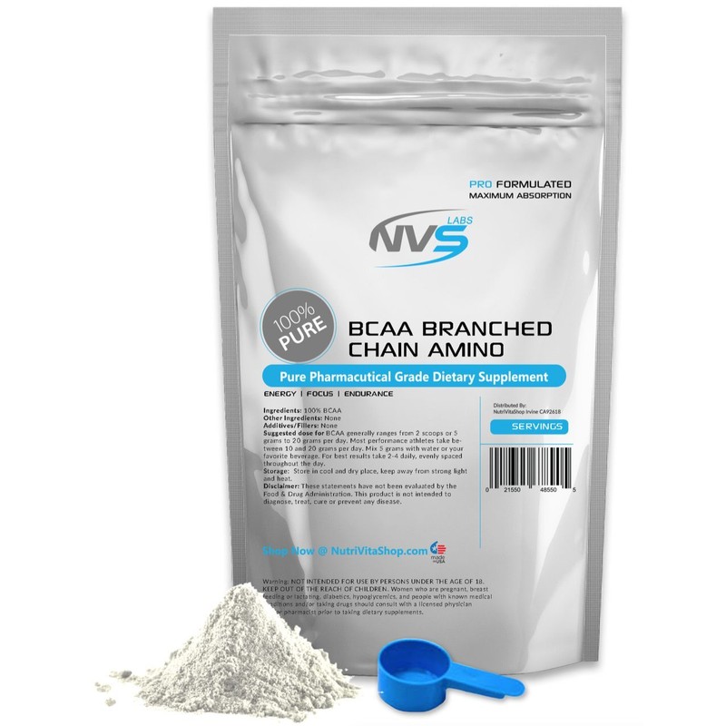 Almost 1/3 of muscle tissue is composed of BCAA which are needed for muscle growth, the maintenance of muscle tissue and to preserve muscle stores of glycogen. BCAA's can turn on the main muscle growth pathway in muscle tissue which can increase protein synthesis and help prevent muscle tissue breakdown after strenuous exercise. Each serving of NutriVitaShop.com ultra-micronized, NutriVitaShop.com's BCAA provides the three free form branched chain amino acids; L-Leucine, L-Valine and L-Isoleucine in the proper 2:1:1 ratio. Supplementing with BCAA supports: