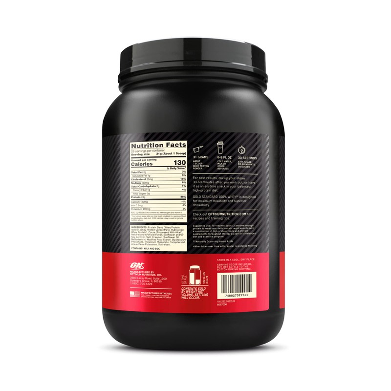 OPTIMUM NUTRITION'S GOLD STANDARD 100% Whey uses pure Whey Protein Isolates as the primary ingredient. Combined with ultra-filtered whey protein concentrate, each serving provides 24 grams of all-whey protein and 5.5 grams of naturally occurring Branched Chain Amino Acids (BCAAs) which are prized by athletes for their muscle building qualities. With more than 20 tempting flavors to choose from, ON GOLD STANDARD 100% Whey gives you plenty of ways to keep workout recovery interesting. Search "ON Apparel TRUE STRENGTH" to see our new ON clothing line!. More than 5g of the Naturally Occurring Leucine, Isoleucine, and Valine in Each Serving. STORE IN A COOL, DRY PLACE.