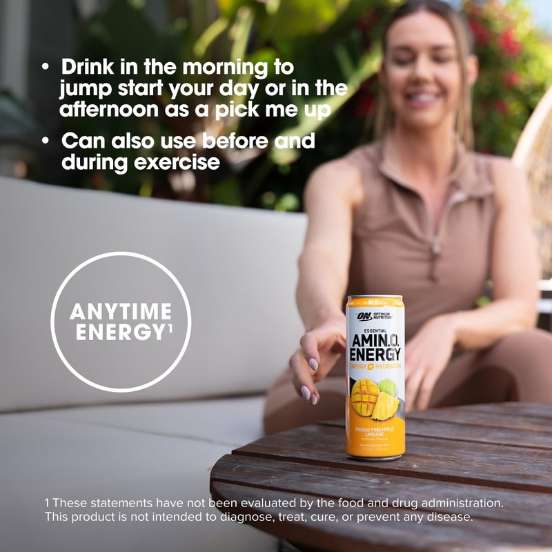 Optimum Nutrition Optimum Nutrition Amino Energy Sparkling Hydration Drink, Electrolytes, Caffeine, Amino Acids, BCAAs, Sugar Free, Mango Pineapple Limeade, 12 Fl Oz, 12 Pack (Packaging May Vary)