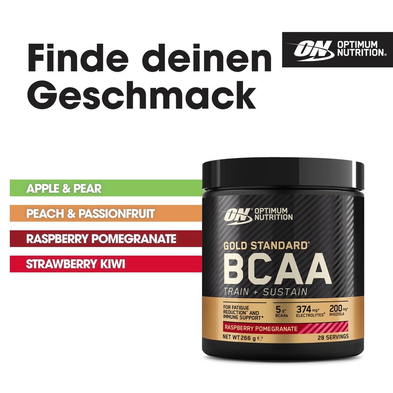 • ON Gold Standard BCAA Train + Sustain enthält 374 mg ELEKTROLYTE, 200 mg RHODIOLA und 2,6 g L-Leucin pro Portion sowie 5 g BCAAs im Verhältnis 2:1:1